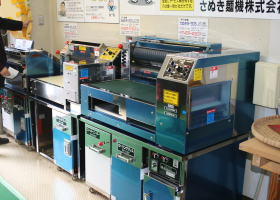 Q.「うどんブーム」も一段落した現在の製麺業界をどのように分析されておられますか。 昭和45年頃の第一次ブームの際は、「さぬきうどん」専門店は、私たちの機械とノウハウの提供により、どんどん儲ってお店は繁盛してもらうことができました。 戦後の経済成長と共に、生活のレベルも向上し、高くてもおいしいものを求める消費者が多くなりました。大量生産を行う製麺工場でも「さぬきうどん」に着目し、高くても売れる商品として製造し、その製造された「さぬきうどん」をぜひ販売したいというスーパーが増えてきました。 平成元年には、大量生産を行う機械を開発しました。その際には、通産省技術改善事業による政府の開発補助金の認定を、四国では当社1社のみいただき、今では1時間に12,000食製造できる機械もあります。 今の「さぬきうどん」ブームは冷凍うどんのおいしさから始まったといってもいいでしょう。へたなうどんを食べるより、冷凍うどんを食べたほうがおいしいという全国からの声があり、そのうどんに対するおいしさに納得してもらえたのです。冷凍うどんが冷凍食品の中で一番伸びている食品で、日本の冷凍食品を支えているといっても過言ではありません。また、「さぬきうどん」は香川県が発祥だというのがやっと全国に分かっていただけたという感があります。
