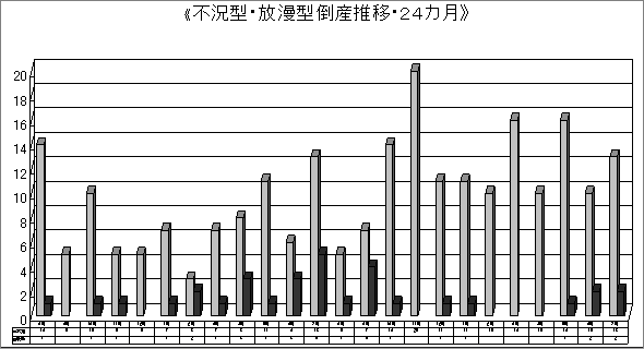 ≪原因別≫ (原因別・前年増減) | 件 数 (単位:件) | 負債額 (単位:百万円) | | 平成20年7月 | 平成19年7月 | 増 減% | 平成20年7月 | 平成19年7月 | 増 減% | | 放 漫 経 営 | 2 | 5 | -60.0% | 188 | 1,487 | -87.4% | | 過小資本 | 1 | 1 | 0.0% | 14 | 500 | -97.2% | | 他社倒産の余波 | | | | | | | | 既往のシワ寄せ | 3 | 1 | 200.0% | 6,090 | 100 | 5990.0% | | そ の 他 | | 2 | -100.0% | | 350 | -100.0% | | 信用性低下 | | 1 | -100.0% | | 20 | -100.0% | | 販 売 不 振 | 10 | 11 | -9.1% | 1,912 | 5,542 | -65.5% | | 売掛金回収難 | | 1 | -100.0% | | 20 | -100.0% | | 在庫状態悪化 | | | | | | | | 設備投資過大 | 1 | | | 72 | | 0.0% | | 合 計 | 17 | 22 | -22.7% | 8,276 | 8,019 | 3.2% |  ☆販売不振が10件でトップ、この他は既往のシワ寄せ(赤字累積)3件、放漫経営2件等。 原因別では販売不振が10件でトップで、既往のシワ寄せ(赤字累積)3件と合わせ不況型が約76%を占めた。放漫経営は2件で、前年比では3件減少。この他は、設備投資過大(1年4か月ぶり)、過小資本(11か月ぶり)が各1件。サービス業・他では既往のシワ寄せ(赤字累積)が2件と放漫経営、設備投資過大が各1件とやや原因が分かれたが、その他の業種はほとんどが不況型に該当した。業種を問わず売上不足や材料の高騰などによる原価アップが利益を圧迫、資金繰りを悪化させ、事業継続が困難となるケースが多い状態が続いていることが窺われる。
