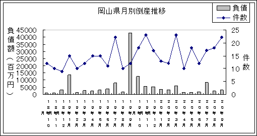 平成20年9月 岡山県内企業倒産整理 〜株式会社東京商工リサーチ 岡山支店 調べ〜| 件数 | 22件 | | 前年同月比 前月比 | 83.3% 増加 5.9% 増加 | (平成19年9月 12件) (平成20年8月 18件) | | 負債総額 | 3,006百万円 | | 前年同月比 前月比 | 93.0% 減少 17.7% 増加 | (平成19年9月 42,792百万円) (平成20年8月 2,555百万円) |