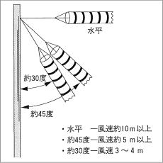 吹き流しが真下に垂れているときは無風から風速約2メートル、角度が約30度で風速3〜4メートル、約45度で風速5メートル、真横(水平)だと風速10メートル以上の風が吹いています。